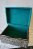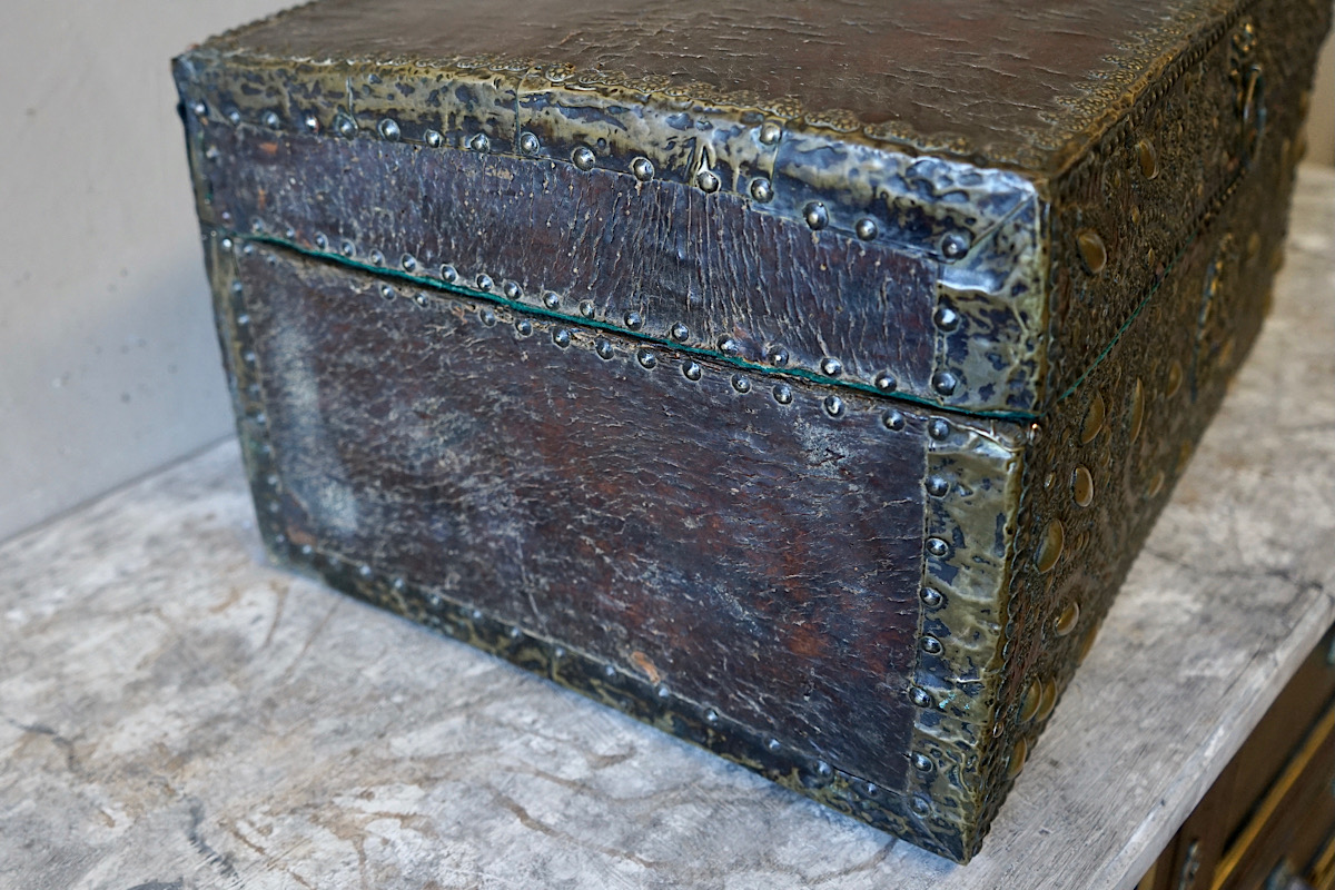 A rare Louis XIII period brass studded, leather covered box/trunk with iron handle. A magnificent example, these were used in Renaissance times to store letters and precious possessions.