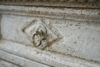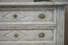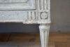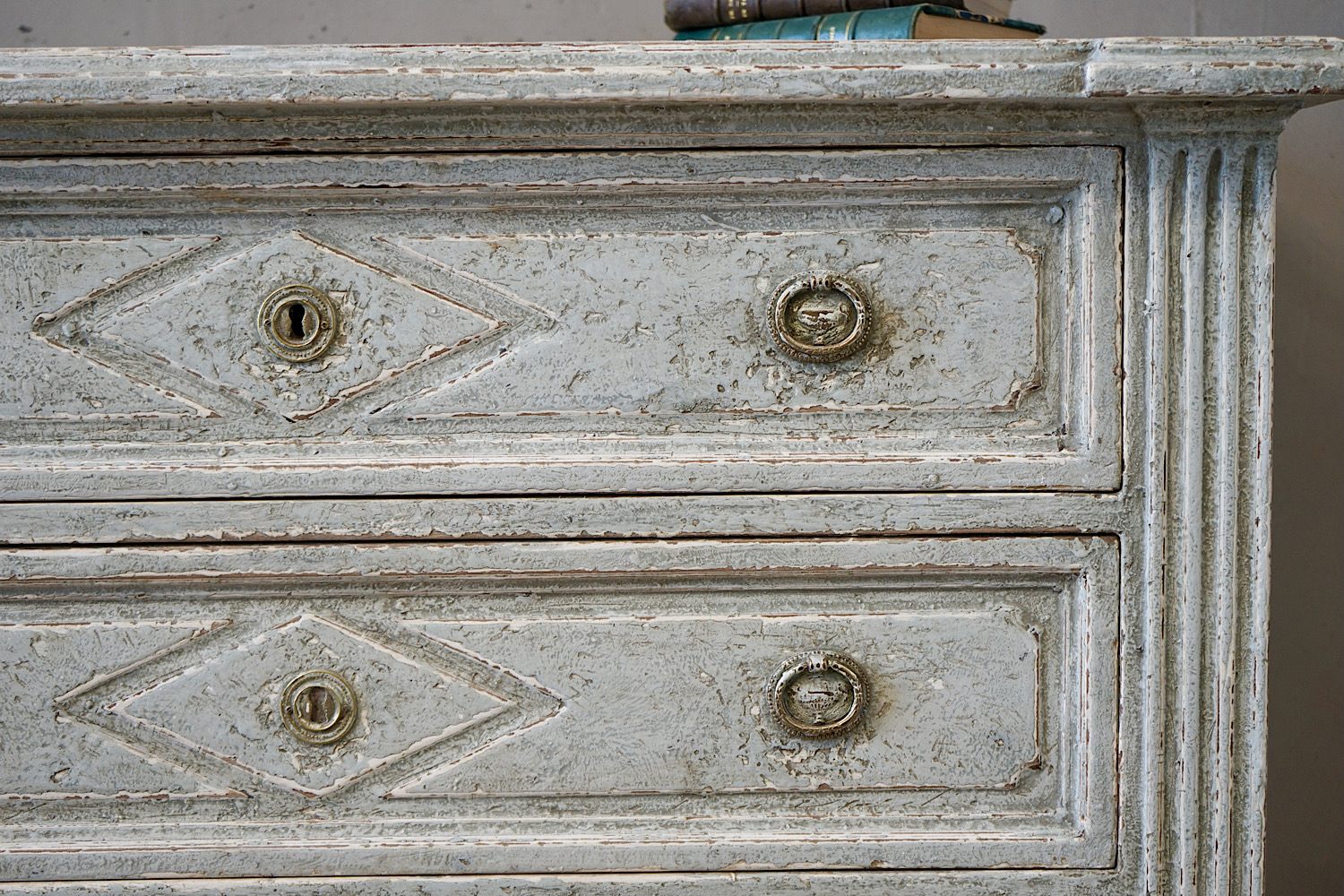 An elegant Directoire style commode of smaller proportions painted in soft blue/grey patina. Lovely geometric neoclassical carved detail including lozenges, fluted pilasters and rosettes.