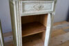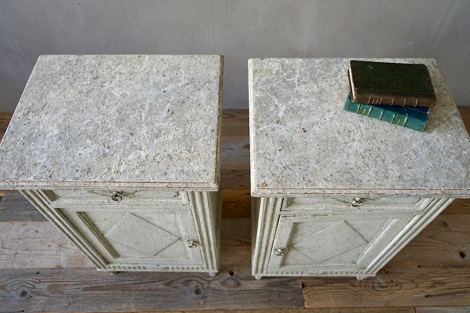 A pair of elegant Directoire style bedside cabinets painted in soft off white/grey patina with faux marble painted tops. Lovely geometric neoclassical carved detail including lozenges & fluted pilasters. Priced and sold as a pair.