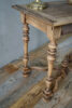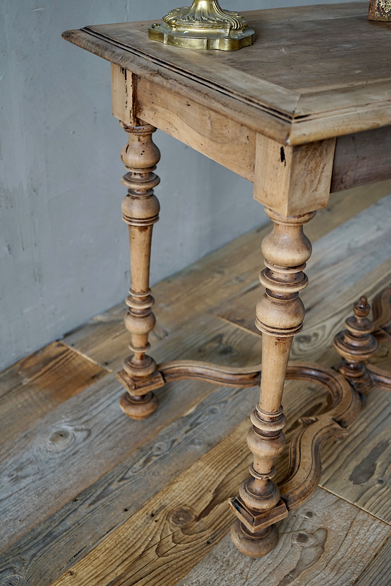 A fine Louis XIV period side table in bare walnut. Lovely form with turned column legs and scrolling stretcher with central finial.