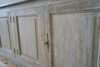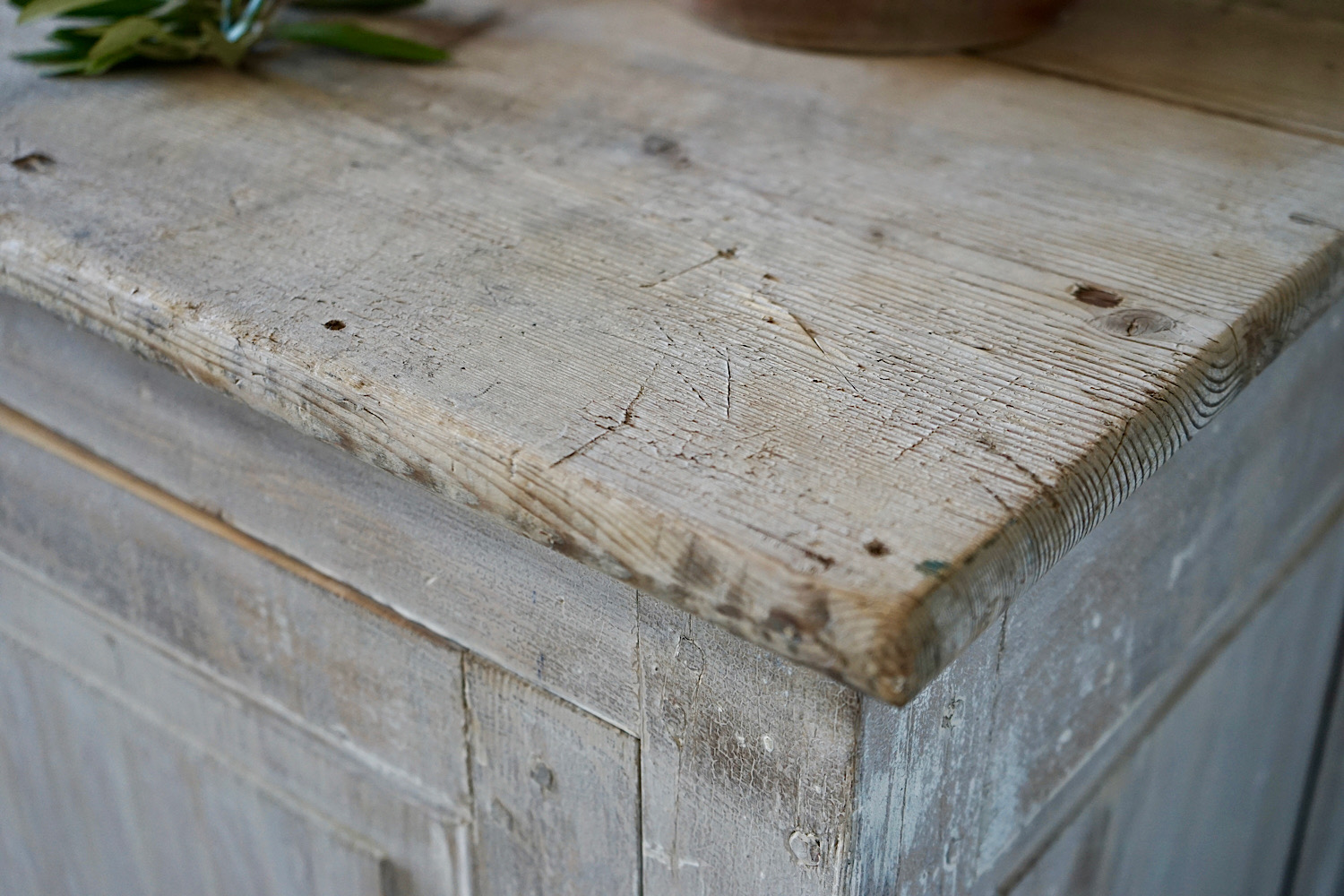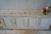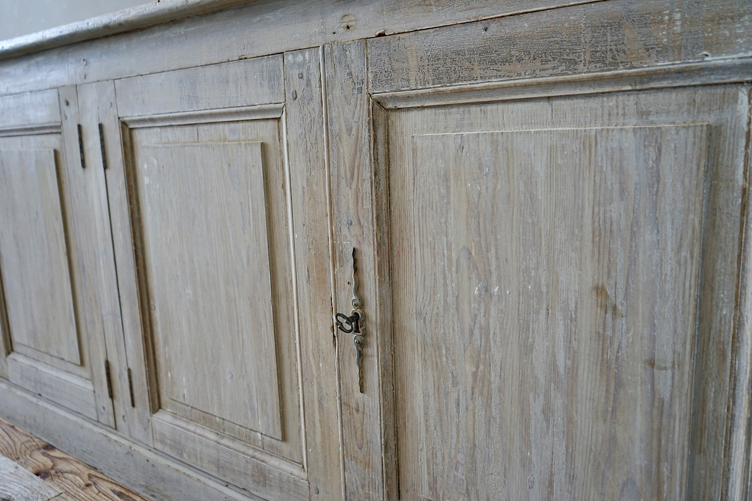 A particularly nice, long French provincial sideboard or cupboard with four panelled doors and original paint showing excellent patina. Scrubbed pine top, also with lovely weathered patina.