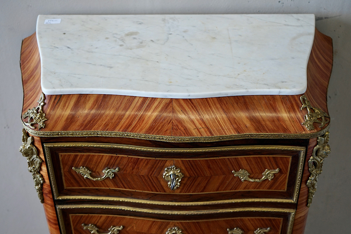 A fine quality Regence-style secretaire in kingwood & rosewood marquetry. Gilded bronze mounts, original marble top. Fall-front fitted interior with small drawers and red leather.