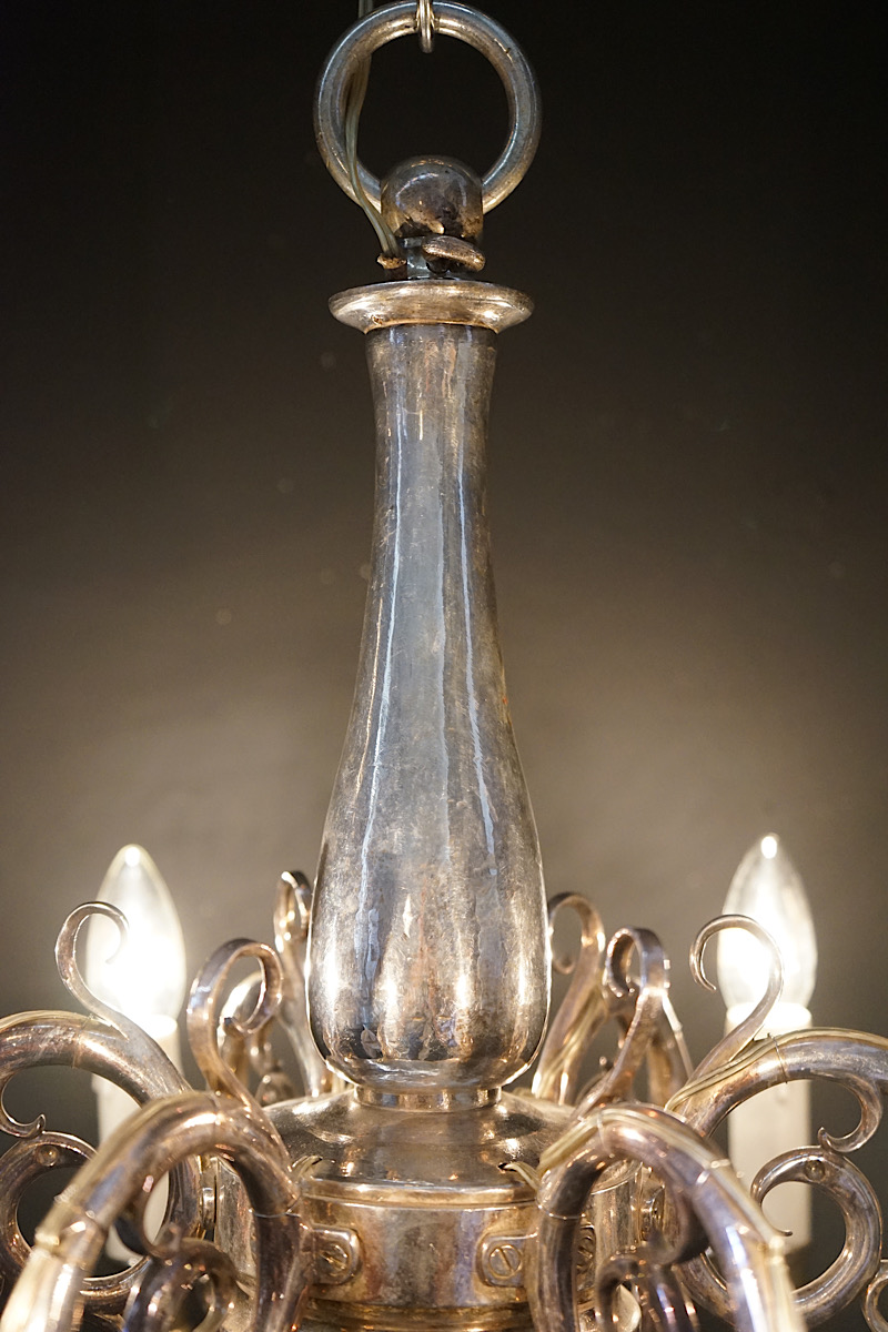 A good quality French six-branch silvered brass chandelier. Scrolling branches around a central baluster, often referred to as “Dutch-style”. Made for candles and discretely rewired to NZ standards. Perfect in a traditional or modern interior.