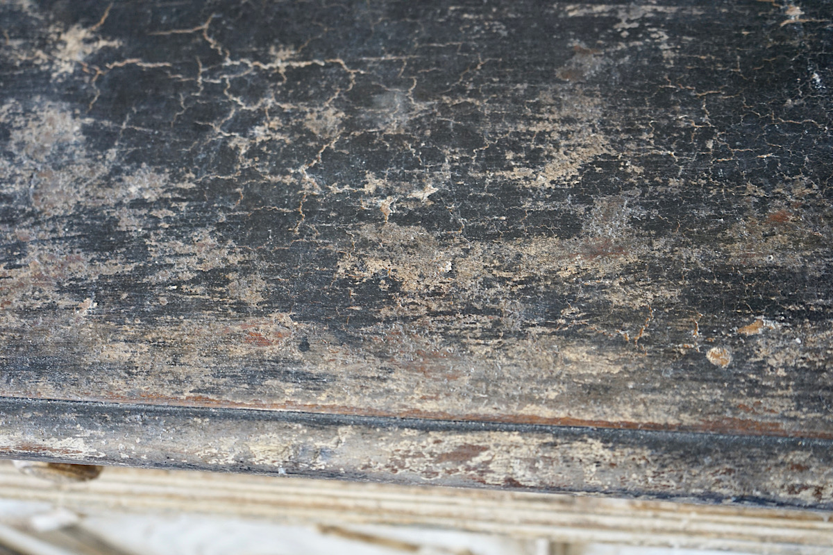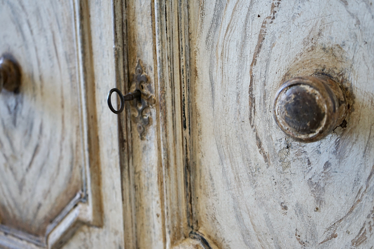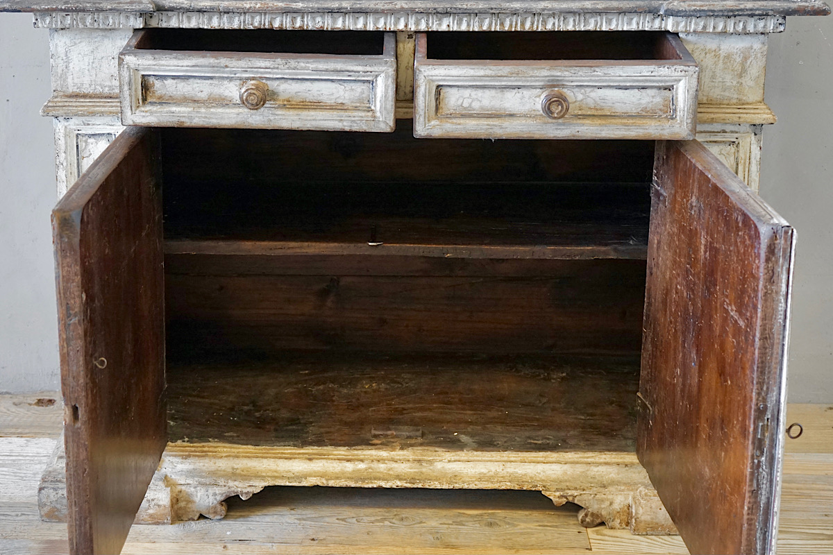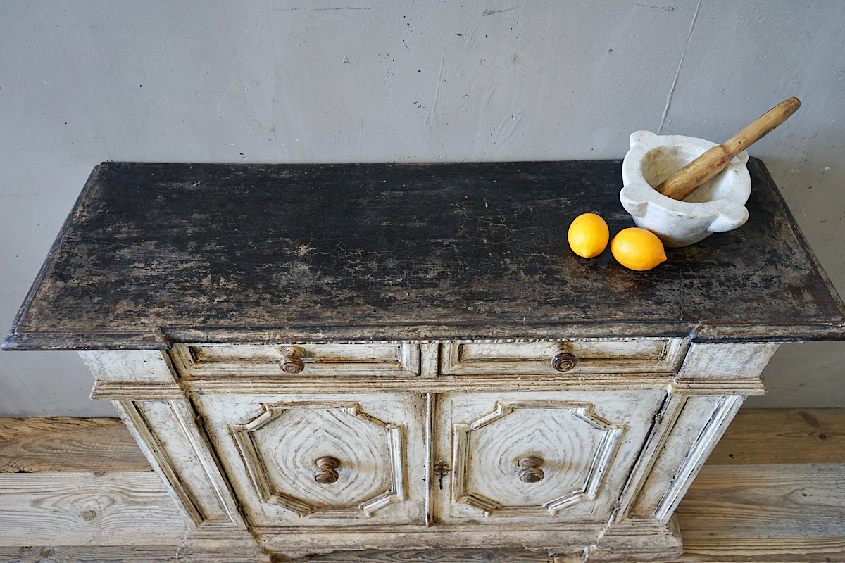 A highly decorative Italian credenza sideboard with panelled doors, carved details and gorgeous original painted patina.