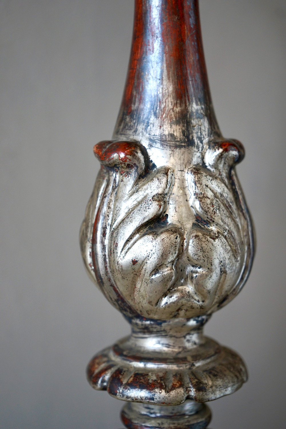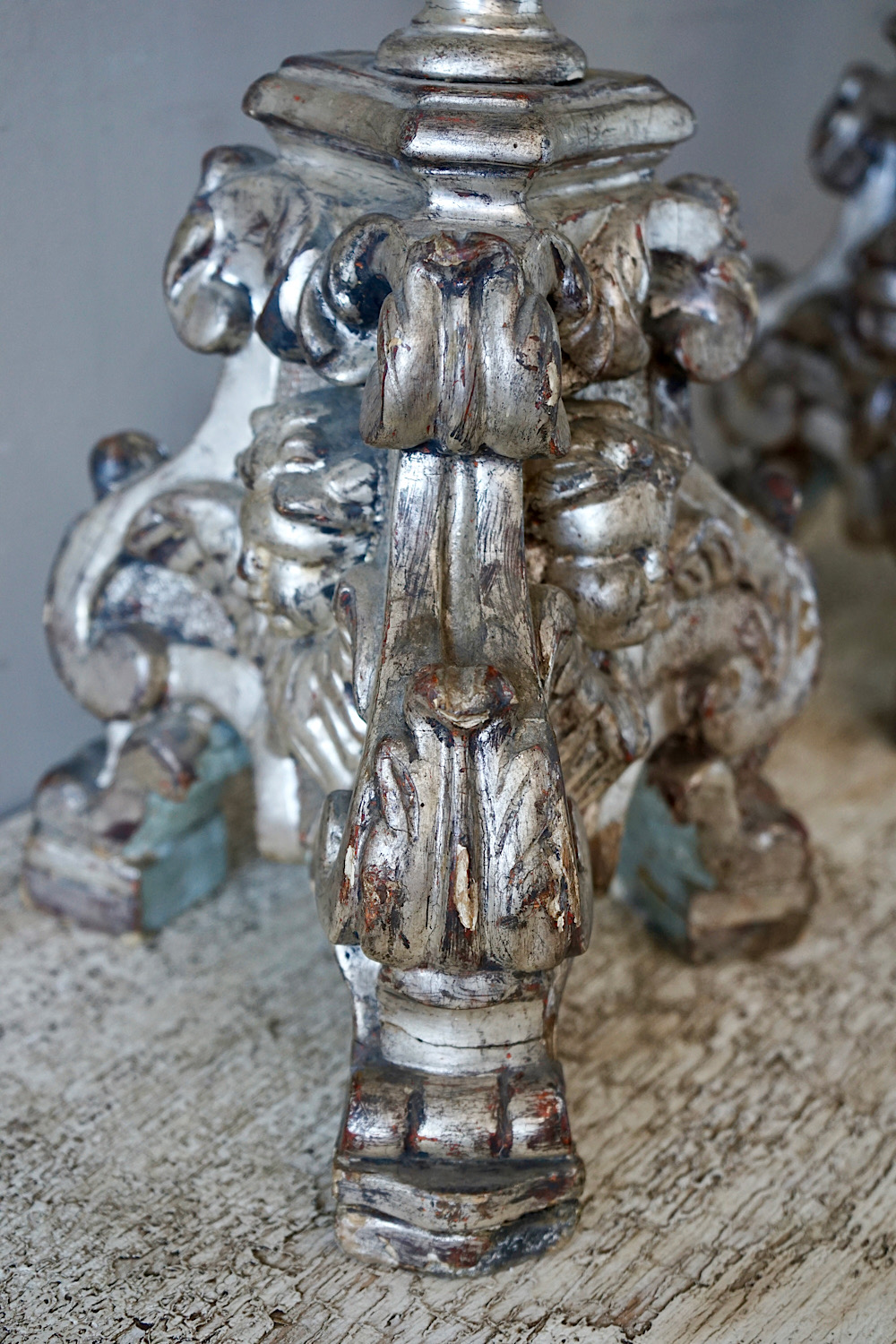 A magnificent pair of Italian rococo carved limewood ‘torcheres’ (candlesticks) with their original silvering. Turned baluster form with carved scrolling detail and winged cherub masks, raised on three scroll feet. Lovely decorative examples in very good original condition and especially desirable being fully decorated and gilded on all three sides. Priced and sold as a pair.
