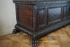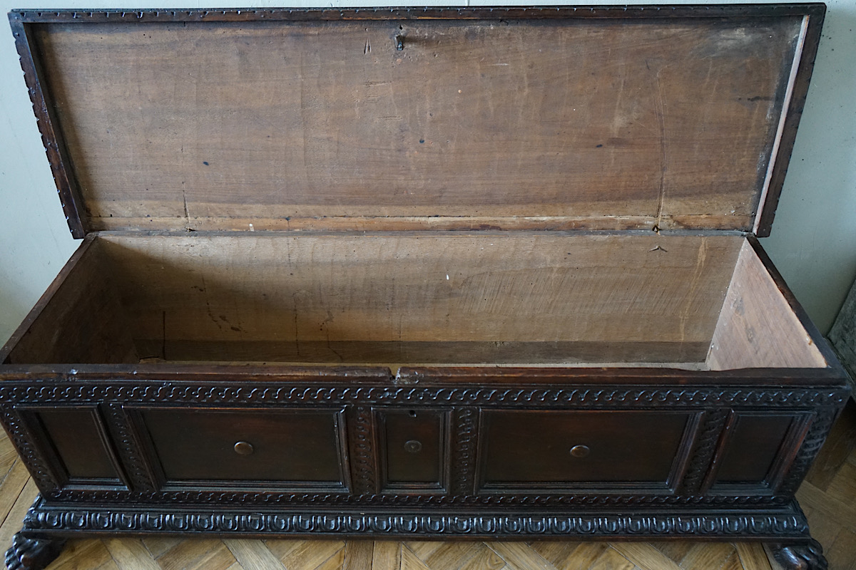 An elegant carved walnut cassone (coffer) from Tuscany. The front featuring five framed panels with carved details, raised on lion’s paw feet. Superb original condition. A fine example.