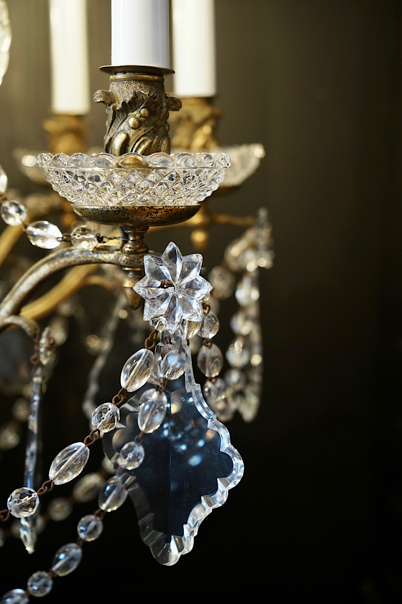 A large, fine quality and highly decorative French eight-branch chandelier with gilded brass frame. Particularly elegant design with fine glass garlands and hand-faceted crystal drops. Made for candles and discretely rewired to NZ standards.